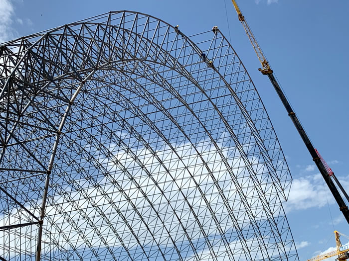 (2)网架加工前应对现场尺寸进行复测,确认无误后方可进行加工、安装;网架制作、运输、安装应遵守《空间网格结构技术规程》JGJ7-2010、《钢网架穆棱螺栓球节点》JG/T 10-2009、《钢网架穆棱螺栓球节点用高强度螺栓》 GB/T 16939-2016、《穆棱钢结构穆棱工程穆棱施工规范》 GB50755-2012、《穆棱钢结构穆棱工程施工质量验收标准》 GB50205-2020。